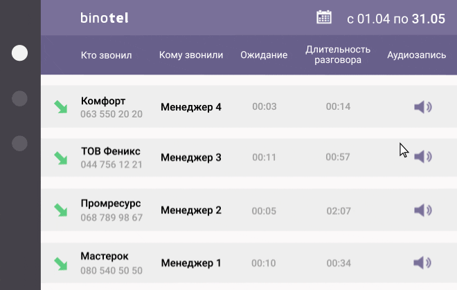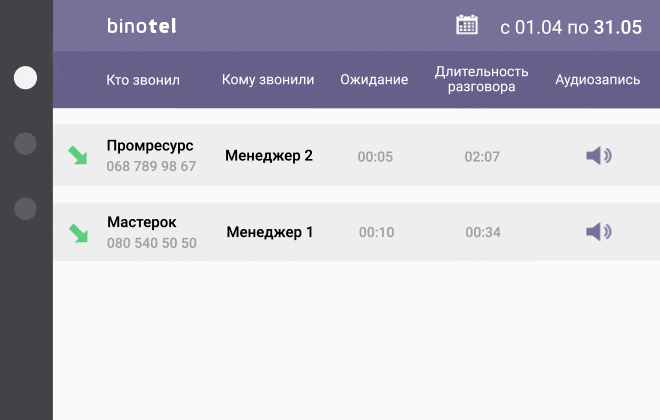 В личном кабинете вы видите всё — входящие, исходящие и пропущенные звонки; длительность каждого звонка; кол-во звонков по каждому менеджеру.